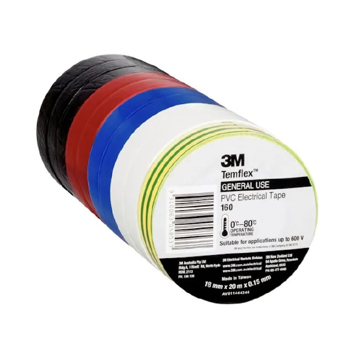 3M 3M160-RBOW TEMFLEX 160 PVC ELECTRICAL INSULATION TAPE 10 ROLLS RAINBOW PACK BLACK/RED/BLUE/WHITE/YELLOW-GREEN 18MMX20MX0.15MM