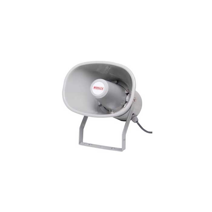 A grey 100V line horn speaker designed for commercial PA installations. Exclusive design incorporates a dog leg mounting bracket which eliminates the need to separate the horn from the bracket during installation.