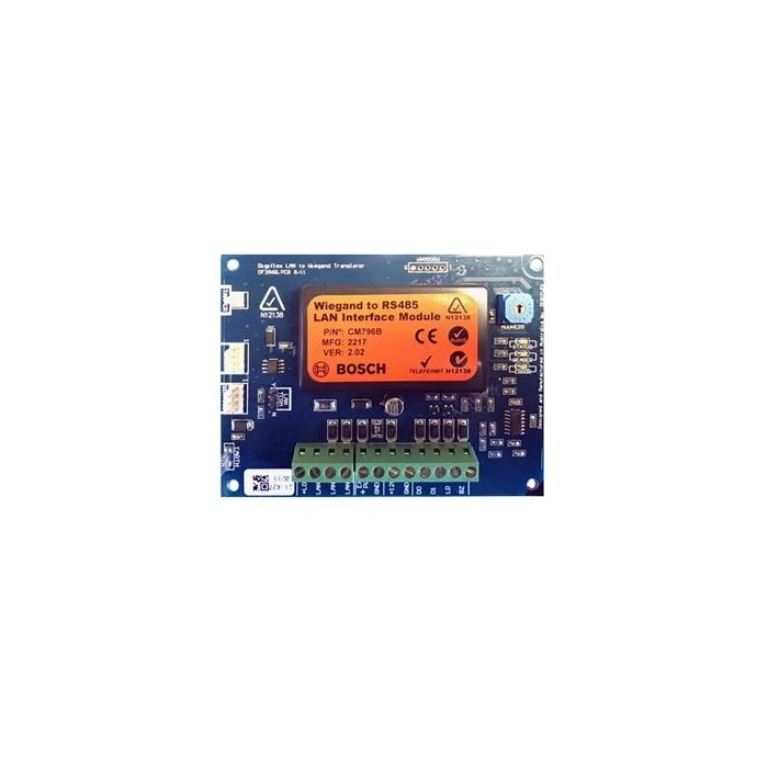 The CM796B Weigand to RS485 Lan Interface module has been developed to allow other 3rd party wiegand proximity readers to be interfaced to the Solution 6000 Control Panel. The module supports Wiegand formats from 26bit to 40bit and includes support for the LED Buzzer control.