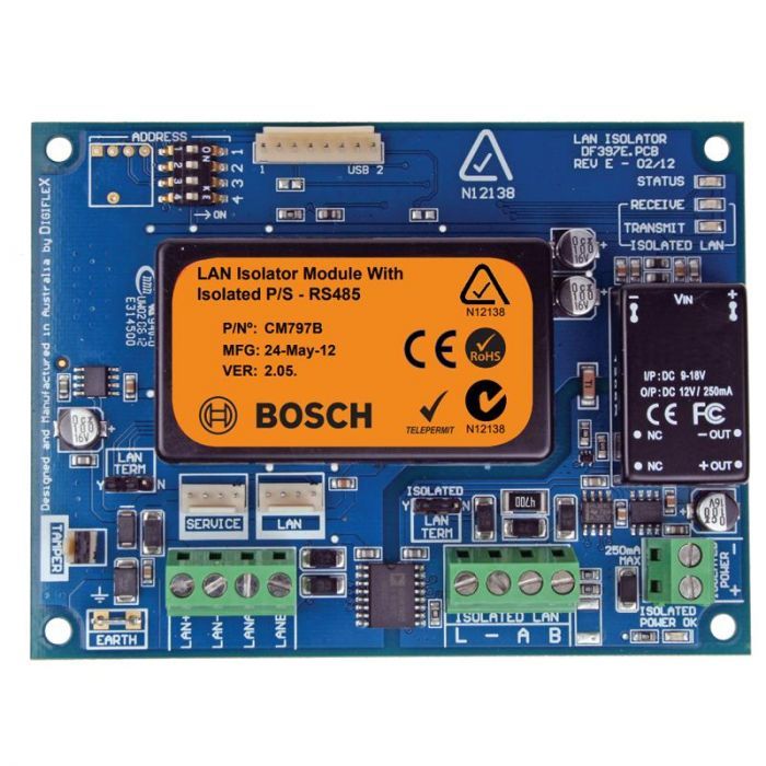 The Bosch CM797B LAN Isolator module provides 2.5KV electrical isolation between different LAN segments or between the LAN and other modules. The isolator also regenerates the LAN signals allowing the total LAN length to be increased beyond the standard length of 1200 meters and also provides a 2.5KV isolated 12V @ 250mA power supply which can be used to power keypads or LAN prox readers providing complete electrical isolation for devices located on the outside of buildings etc.