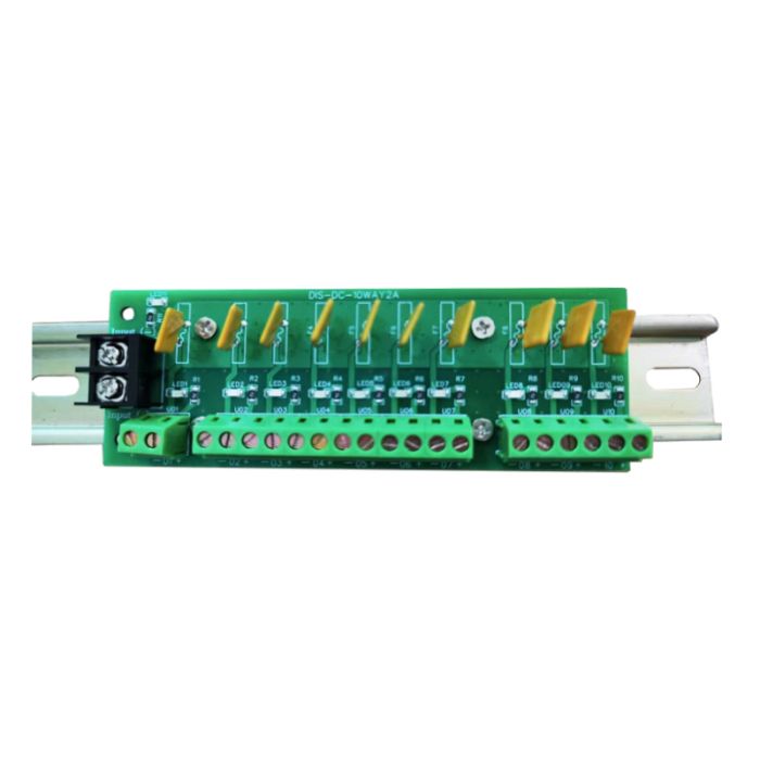 A 20A power distribution board with 10 self-healing fused outputs (2A each), status LEDs, and support for 10-28V DC/AC. Designed for easy installation, it features DIN rail mounting or adhesive tape for quick setups.