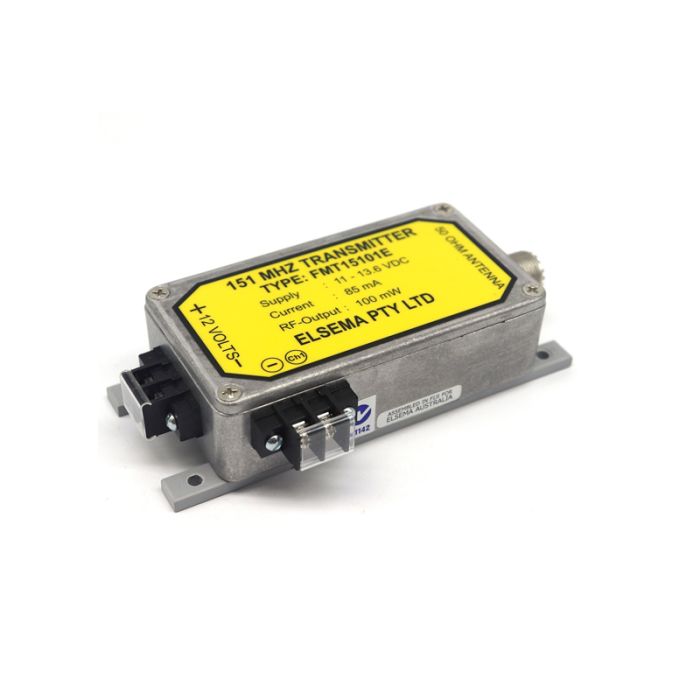 The FMT151 series gives a controlled range of up to 5km. The controlled operation can be any electronic or electrical operated device when used with the FMR151… series of receivers The channels are activated via screw type terminals onto which the user can connect reed switches, toggle switches, push buttons