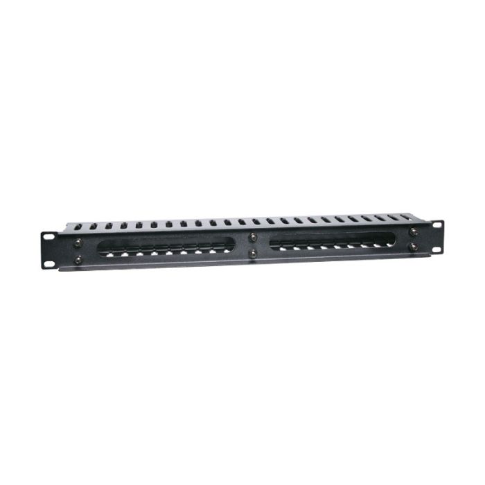 Slotted panels for management of patch leads in IT and comms racks. Durable black powder coated finish. Features plastic slotted tabs and slide on rear panel cover for a neat finish.