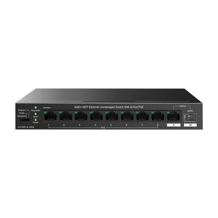 G1110PF-8-120W, 9GE+1SFP Ethernet unmanaged switch with 8-port PoE, is independently designed by IP-COM. It supports IEEE 802.3af/at standards for PoE power supply, capable of transmitting data and supplying power for 8 HD PoE cameras or gigabit APs. The maximum PoE output of a single port is 30W and the total power consumption of the switch is 120W.Supporting three-mode toggle, G1110PF-8-120W is suitable for complex networking deployment and is your ideal choice for video surveillance and gigabit wireless networking in such scenarios as SMEs, residential areas,industrial parks,hotels and schools.