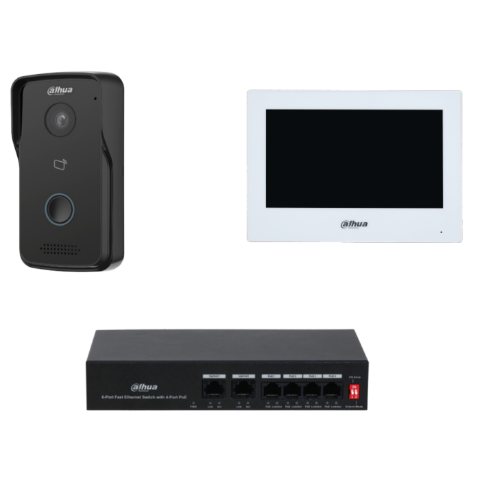 DAHUA KTP03W-S2 IP VIDEO INTERCOM KIT 7 INCH TOUCHSCREEN MONITOR 1-BTN DOOR STATION IP65 4-PORT POE SWITCH BLACK/WHITE