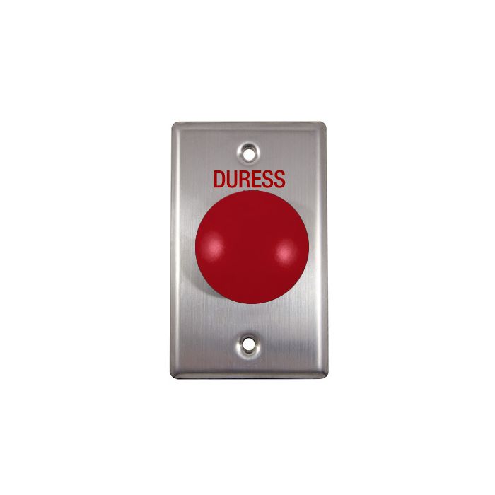 Stainless GPO Plate with Red Mushroom Momentary Button Printed red text - Duress