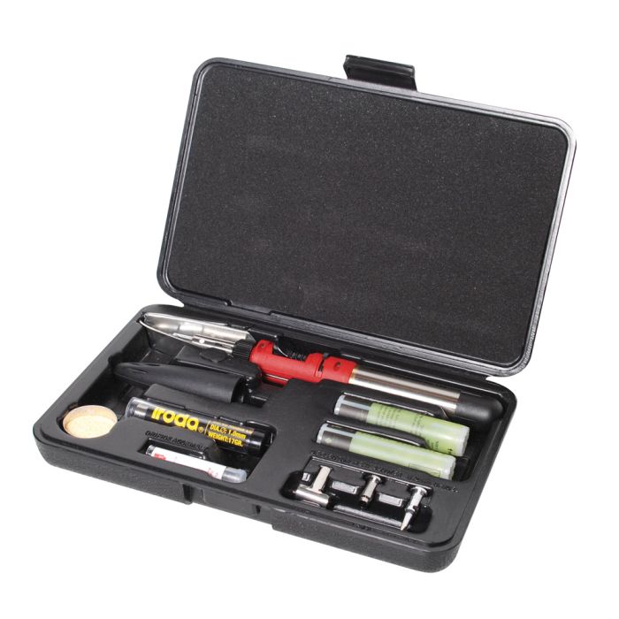 Soldering Iron Gas Cartridge Kit 125 Watt Kit incl. Gas Iron (T2630), Replacement Gas Filter, Solder Reel (17gm), Sponge, Heat Deflector, Heat Blower, 3.2mm Chisel Tip and 2 x LEC 20ml Cartridges. All inside a carry case