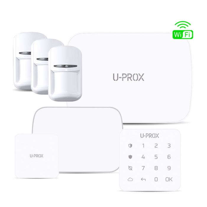 Wireless alarm system kit: central panel with LTE+ Wi-Fi + Ethernet + Dual Sim communicator for monitoring stations and cloud, Li-ion back up battery 2600 mAh , 24 hours back up time. 3 U-Prox PIR motion detector (pet immune up to 20 kg) with CR123A lithium battery, home piezoelectric Siren with two CR123A and piezoelectric outdoor Siren with 4 CR123A lithium batteries.